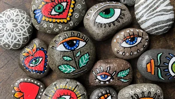 Materiales necesarios: Piedras lisas de tamaño pequeño a mediano, pinceles, pinturas acrílicas, agua, paleta de colores, hojas o ramas secas para decoración.